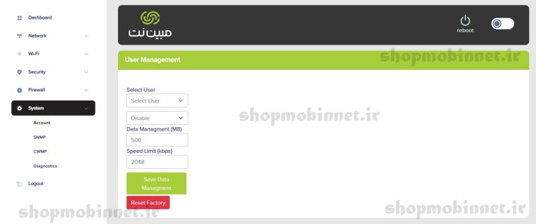 برای بازگشت به حالت کارخانه وارد بخش system و زیر شاخه account و دکمه قرمز reset factory را بزنید
