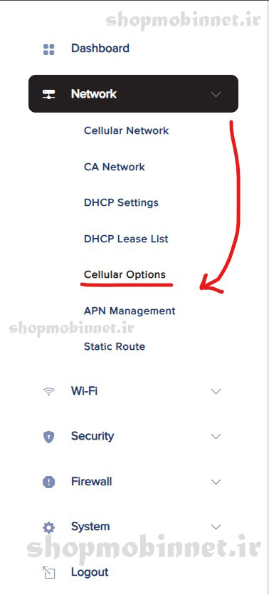 - بعد از وارد شدن به آی پی طبق دستور العملی که در مرحله 5 خواندیم وارد بخش network و زیر شاخه cellular option بروید