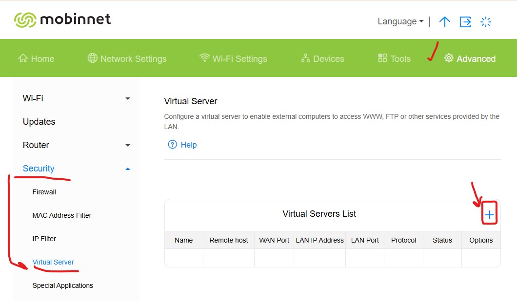 - وارد بخش advanced و زیرشاخه security و virtual server شوید