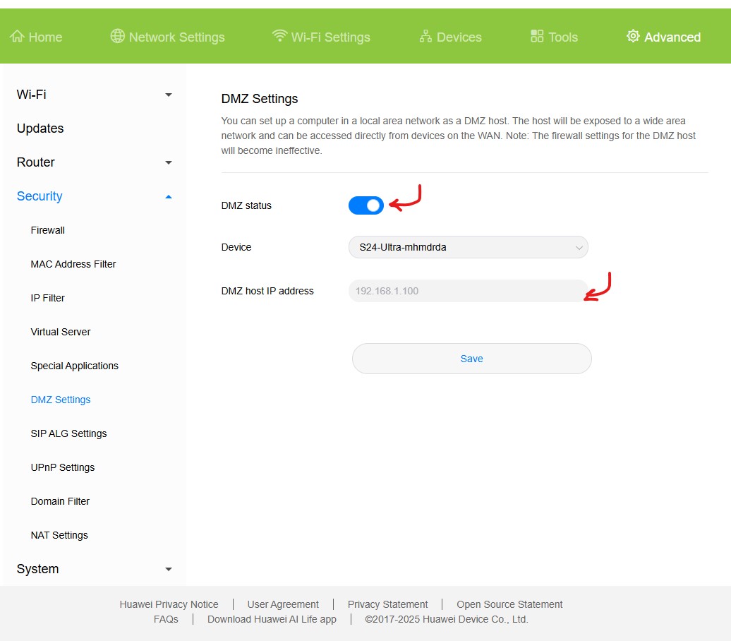 - وارد بخش advanced و زیرشاخه secutity و DMZ setting شوید