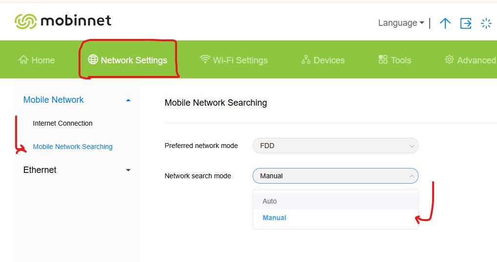 - بعد از وارد شدن به آی پی طبق دستور العملی که در مرحله 5 خواندیم وارد بخش network setting و زیر شاخه mobile network searching بروید